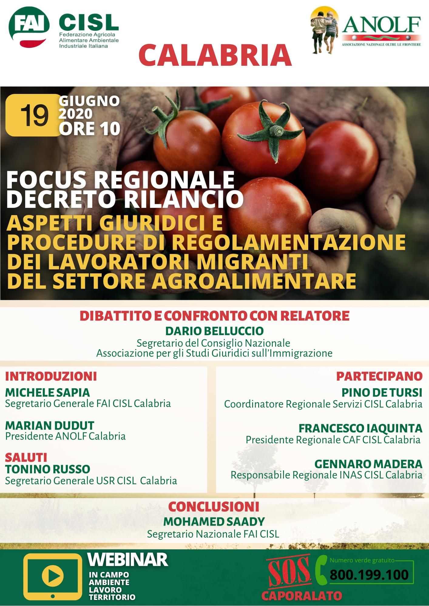 LAMEZIA TERME, 19 GIUGNO 2020 – Si è svolto questa mattina, in videoconferenza il webinar organizzato dalla Fai Cisl Calabria e dall’Anolf Calabria in collaborazione con la Fai Cisl e Anolf nazionali, dal titolo: “Focus Regionale Decreto Rilancio – Aspetti giuridici e procedure di regolamentazione dei lavoratori migranti del settore agroalimentare”.