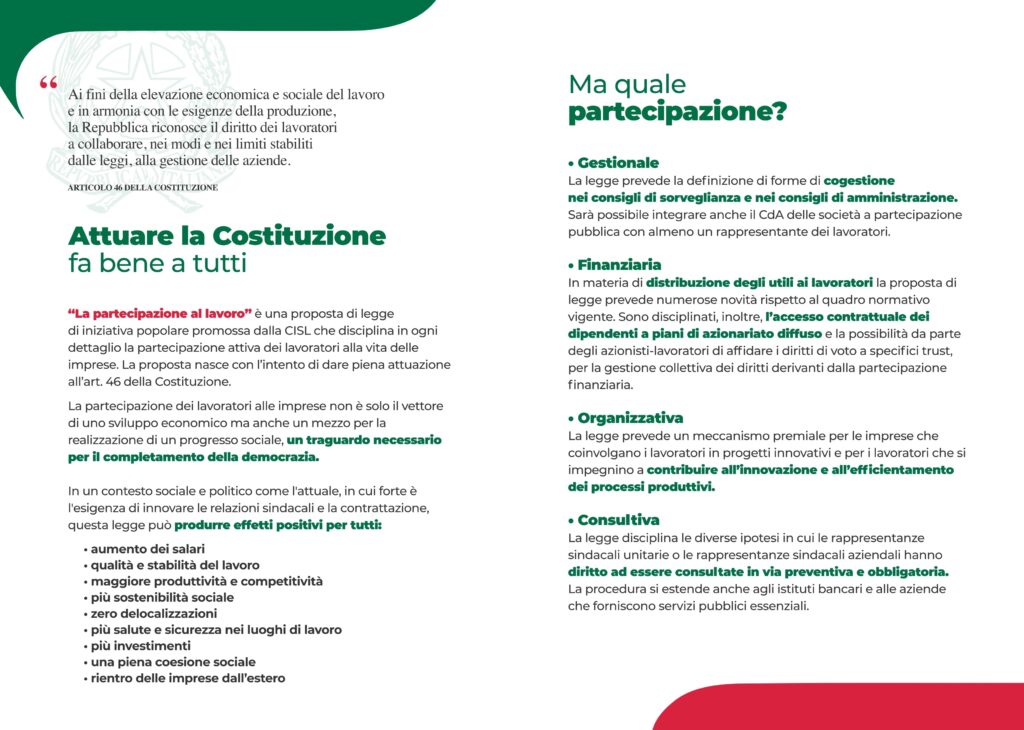 “La partecipazione al lavoro” è una proposta di legge di iniziativa popolare promossa dalla CISL che disciplina in ogni dettaglio la partecipazione attiva dei lavoratori alla vita delle imprese. La proposta nasce con l’intento di dare piena attuazione all’art. 46 della Costituzione.