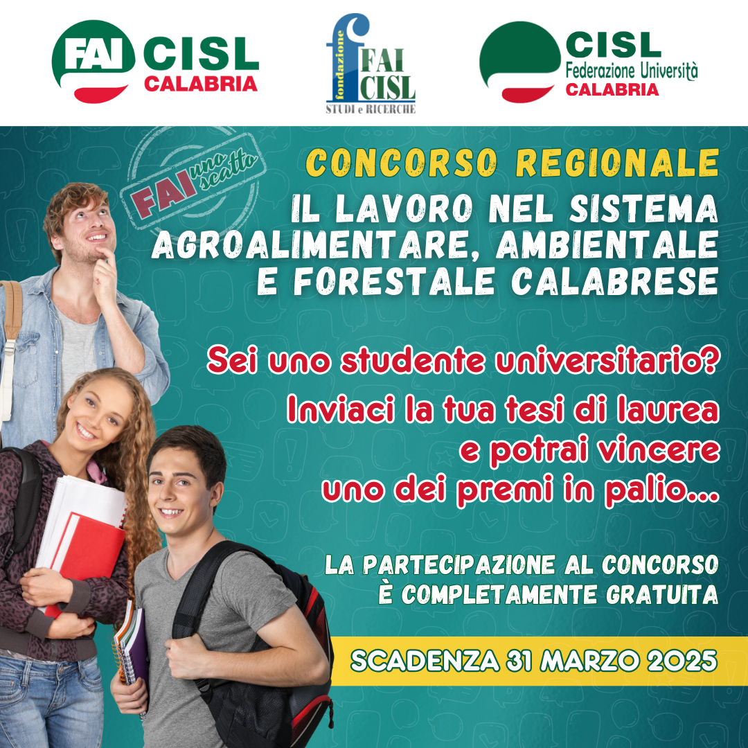 La Fai Cisl Calabria e la Federazione Cisl Università Calabria in collaborazione con la Fondazione Fai Cisl – Studi e Ricerche indicono un bando regionale denominato “FAIunoscatto – Il lavoro nel sistema agroalimentare, ambientale, forestale calabrese”.